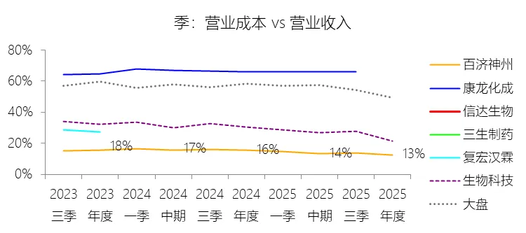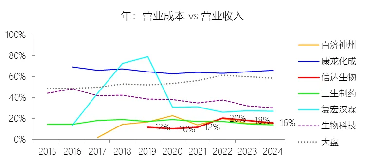 营业成本:2025年,信达生物的营业成本为17.56亿元,同比增长16.28%,与营业收入的比例为13.46%(营业成本率,即1-毛利率),同比下降2.56个百分点;2015-2024年(十年),此项合计为45.95亿元,平均比例为15.64%,比生物科技行业的均值低19.7个百分点,长期呈上升趋势。比例短期下降主要由于信达生物在2025年实现了营收跨越百亿后的规模效应显著释放,产品产量大幅增加带动了单位生产成本的持续优化,同时更有利的上市产品组合结构以及生产工艺的进一步改进,使得营业收入的增长速度(38.42%)远高于营业成本的增长速度(16.28%),推动毛利率提升至86.54%。比例长期上升主要由于公司经历了从纯研发型企业向大规模商业化药企的战略转型,早期因无产品销售导致营业成本基数为零或极低,自2019年核心产品达伯舒上市以来,原材料、人工及制造费用随销售规模扩大呈结构性增长,且期间由于核心品种多次参与国家医保目录(NRDL)谈判定价下调,在销量爆发初期自然推高了成本占收入的比重。比例低于生物科技行业的均值主要由于信达生物建立了高度集成的全面生物制药平台,其苏州及杭州基地已投入运行的产能高达14万升,通过18套3,000升大规模不锈钢生物反应器产线实现了国际领先的单批次生产规模,从而获得了极具竞争力的低单位成本优势;同时,公司凭借卓越的研发实力与礼来、武田、罗氏等巨头达成多项重磅全球战略合作,由此产生的高毛利授权费收入进一步稀释了整体成本率,使其生产效率与资源利用率持续领跑行业。