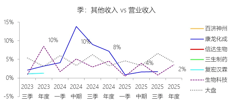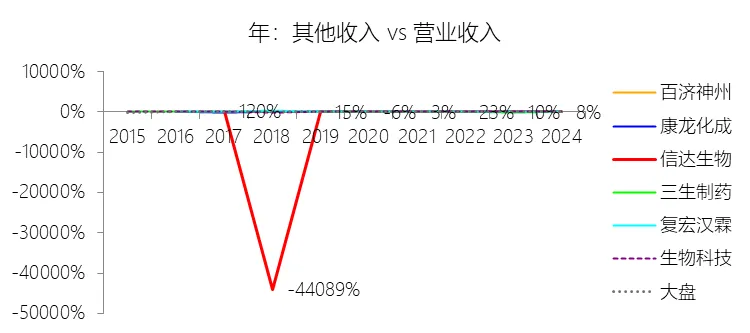 其他收入:2025年,信达生物的其他收入为3.13亿元,同比减少60.15%,与营业收入的比例为2.40%,同比下降5.94个百分点;2015-2024年(十年),此项合计为-16.81亿元,平均比例为-5.72%,比生物科技行业的均值低10.22个百分点,长期呈上升趋势。此项为原财报的其他收入和其他收益及虧損的合计值。比例短期下降主要由于信达生物2025年的“其他收益及亏损”项目受外币汇率变动的不利影响,由2024年的收益2.50亿元转为亏损2.47亿元,导致该项合计净额由上年的7.86亿元大幅缩减至3.13亿元,加之同年营业收入跨越百亿大关并保持38.42%的高速增长,分母端的快速扩张进一步稀释了该项占比。比例长期上升主要由于公司在2018年上市前后经历了资本结构的重大调整,早期(特别是2018年)因优先股公允价值变动产生了一次性、非现金的巨额账面亏损(约43.38亿元),随着IPO完成及优先股转换为普通股,此类大规模减值因素彻底消除,同时随公司业务规模扩大和现金储备增加,银行利息收入与政府补助稳步提升,驱动该项比例从深负值逐步向常态化水平回升。比例低于生物科技行业的均值主要由于信达生物在过去十年中,因上市前的融资安排承担了远超行业常规水平的优先股公允价值变动损失,这一历史性非现金支出显著拉低了十年合计的平均比例;此外,信达生物的营业收入复合增速显著领跑行业,使得在总收入构成中,以利息和补助为主的辅助性收入占比在规模效应下自然低于行业平均水平,反映出公司收入结构更向核心产品销售和全球授权费收入集中。