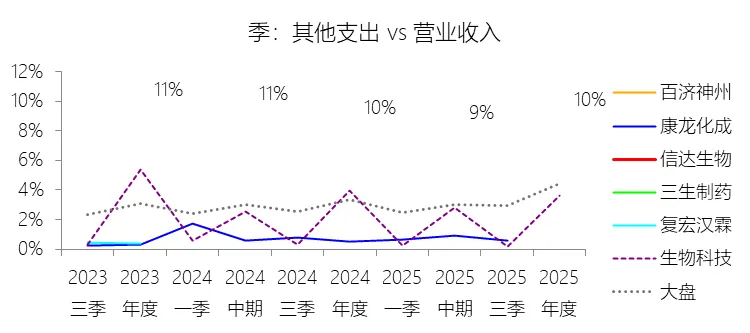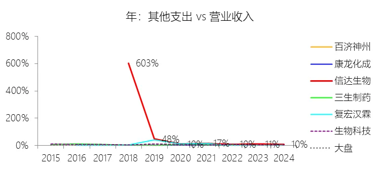 其他支出:2025年,信达生物的其他支出为13.19亿元,同比增长46.34%,与营业收入的比例为10.12%,同比上升0.55个百分点;2015-2024年(十年),此项合计为36.87亿元,平均比例为12.55%,比生物科技行业的均值高6.74个百分点,长期呈下降趋势。此项对应原财报的特許權使用款項及其他相關付款。比例短期上升主要由于信达生物2025年特许权使用款项及其他相关付款的增速(46.34%)超过了同期营业收入的增速(38.42%),这主要受到公司多款通过外部引进或共同开发的重磅产品在商业化阶段进入爆发期,从而触发了更多的销售阶段里程碑付款、利潤分成及支付予第三方的特許權使用費支出;比例长期下降主要由于信达生物经历了从研发初期向大规模商业化跨越的过程,早期在收入基数极小时(如2018年该项比例曾高达603.43%)引进管线产生的前期授权费支出导致占比畸高,而随着核心产品达伯舒及后续多款商业化产品的收入规模呈现爆发式增长,规模效应显著稀释了固定或阶段性的特许权相关付款,使该项比例随收入端跨越百亿大关而自然回归至更合理的水平;比例高于生物科技行业的均值主要由于信达生物长期坚定执行深度外部合作与“引进来”战略,其已上市的18款产品及在研管线中包含大量与礼来、武田、罗氏、赛诺菲、Incyte等国际巨头合作的资产,这种广泛的全球战略合作模式在显著降低研发风险、加速管线商业化的同时,也使得其在利润分成和特许权支出方面的成本结构相较于行业均值表现出更强的外部依赖性和更高的支出占比。