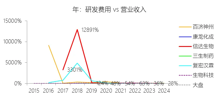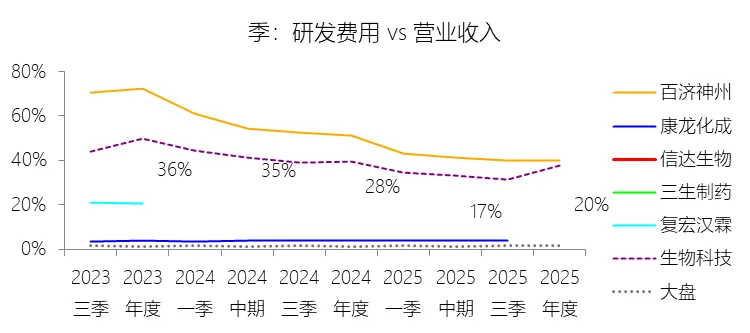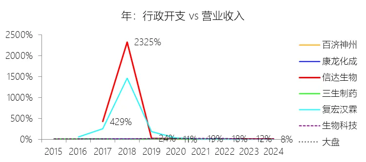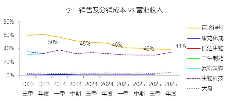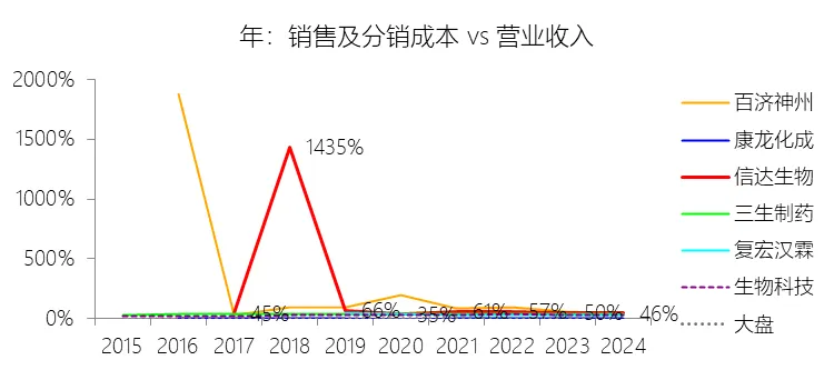 销售费用:2025年,信达生物的销售及分销成本为57.13亿元,同比增长31.43%,与营业收入的比例为43.81%(销售费用率),同比下降2.33个百分点;2015-2024年(十年),此项合计为148.36亿元,平均比例为50.51%,比生物科技行业的均值高18.65个百分点,长期呈下降趋势。