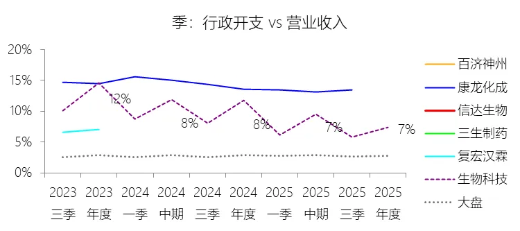 管理费用:2025年,信达生物的行政开支为9.27亿元,同比增长25.6%,与营业收入的比例为7.11%(管理费用率),同比下降0.73个百分点;2015-2024年(十年),此项合计为41.75亿元,平均比例为14.21%,比生物科技行业的均值低2.18个百分点,长期呈下降趋势。