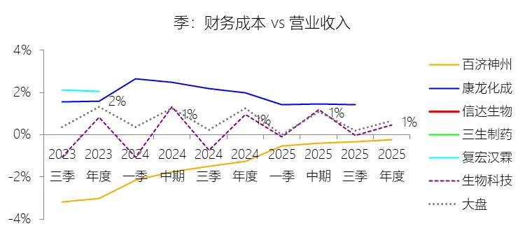 财务费用:2025年,信达生物的财务成本为0.80亿元,同比增长17.67%,与营业收入的比例为0.61%,同比下降0.11个百分点;2015-2024年(十年),此项合计为6.38亿元,平均比例为2.17%,比生物科技行业的均值高0.63个百分点,长期呈下降趋势。