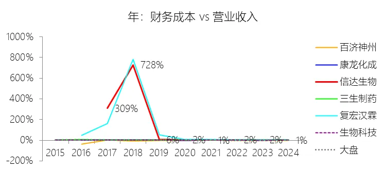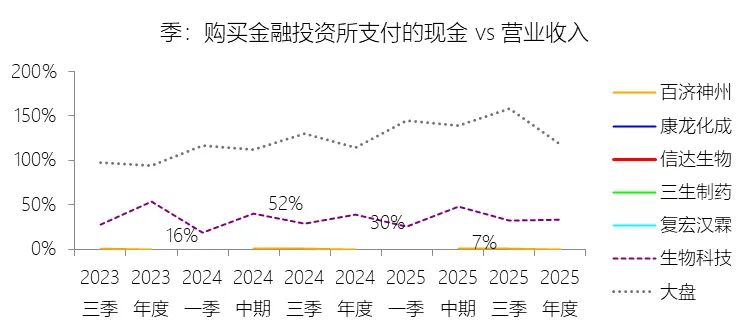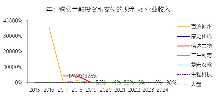 购买金融投资所支付的现金:2025年,信达生物的购买金融投资所支付的现金缺数据,与营业收入的比例无效;2015-2024年(十年),此项合计为133.82元,平均比例为45.56%,比生物科技行业的均值低24.61个百分点,长期呈下降趋势。