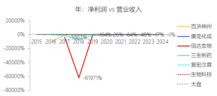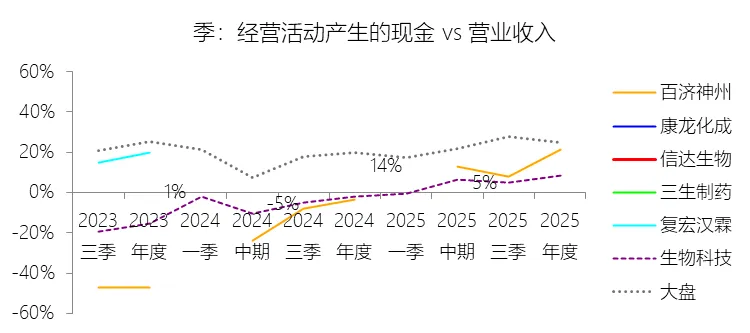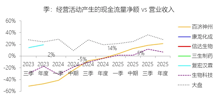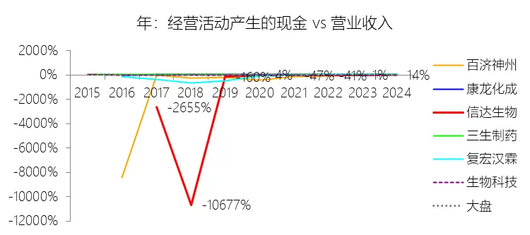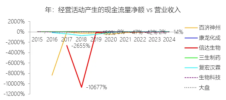 经营活动产生的现金:2025年,信达生物的经营活动产生的现金缺数据,与营业收入的比例无效;2015-2024年(十年),此项合计为-62.44元,平均比例为-21.26%,比生物科技行业的均值高1.57个百分点,长期呈上升趋势。