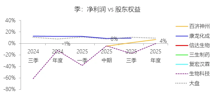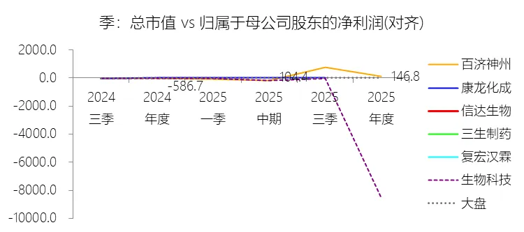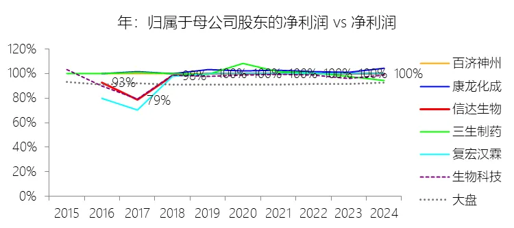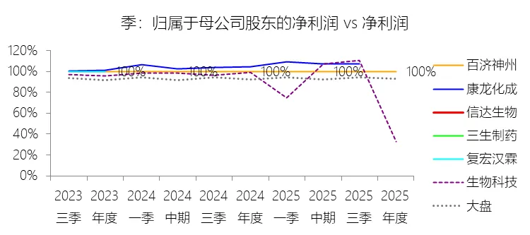 归属于母公司股东的净利润:2025年,信达生物的归属于母公司股东的净利润为8.14亿元,与净利润的比例为100.00%,同比持平;2015-2024年(十年),此项合计为-155.87亿元,平均比例为98.14%,比生物科技行业的均值低0.3个百分点,长期呈上升趋势。