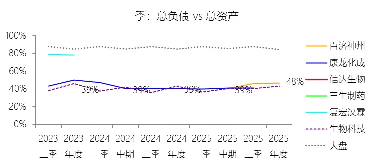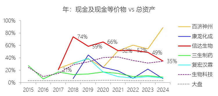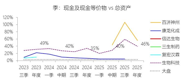 现金及现金等价物:2025年末,信达生物的现金及现金等价物为173.45亿元,对比年初增长131.01%,与总资产的比例为46.44%,同比上升11.69个百分点;2015-2024年(十年),此项与总资产的平均比例为48.94%,比生物科技行业的均值高14.65个百分点,长期呈下降趋势。