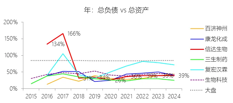 负债率:2025年末,信达生物的总负债为179.92亿元,对比年初增长112.04%,与总资产的比例为48.17%(负债率),同比上升8.9个百分点;2015-2024年(十年),此项与总资产的平均比例为41.93%,比生物科技行业的均值低1.49个百分点,长期呈下降趋势。比例短期上升主要由于信达生物在2025年成功实施了里程碑式的全球战略合作,特别是与武田制药达成的交易所带来的11亿美元现金首付款被记入负债端的合同负债项下,导致公司合同负债总额由2024年末的约8.24亿元激增至2025年末的84.61亿元,这种因业务爆发、预收款项高增带来的增速(112.04%)显著超过了同期总资产因配售及经营积累带来的增速(72.89%),从而在账面上推高了负债率;比例长期下降主要由于公司完成了从研发型企业向商业化领军药企的战略转型,2018年上市后原有的优先股金融负债转为股东权益,且随后在2020年至2025年间多次通过配售新股筹集巨额资金(如2021年筹资约47亿港元、2025年筹资约42.65亿港元),使股东权益的扩张速度显著快于债务积累,加之公司在2024年和2025年率先实现盈利,增长模式逐步向内生现金流驱动转变,资产负债结构持续优化;比例低于生物科技行业的均值主要由于信达生物具备行业领先的融资效率与资金实力,其资本开支更多依赖于通过全球战略合作获得的高额首付款(如2025年获得的总计超15亿美元首付款潜能)和股权融资,而非单纯依靠银行贷款等计息借款,截至2025年末其现金储备高达173.45亿元,占总资产比例为46.44%,远高于行业均值,这种“高现金、低计息债”的稳健财务结构使其整体负债水平在行业普遍处于高投入、高杠杆的阶段中保持在较低区间。