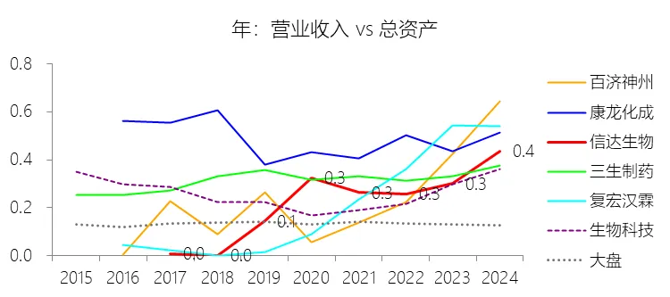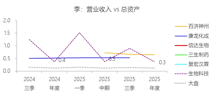 总资产周转率:2025年,信达生物的总资产周转率为0.3次,同比下降0.09次;2015-2024年(十年),平均总资产周转率为0.3次,比生物科技行业的均值高0.02次,长期呈上升趋势。