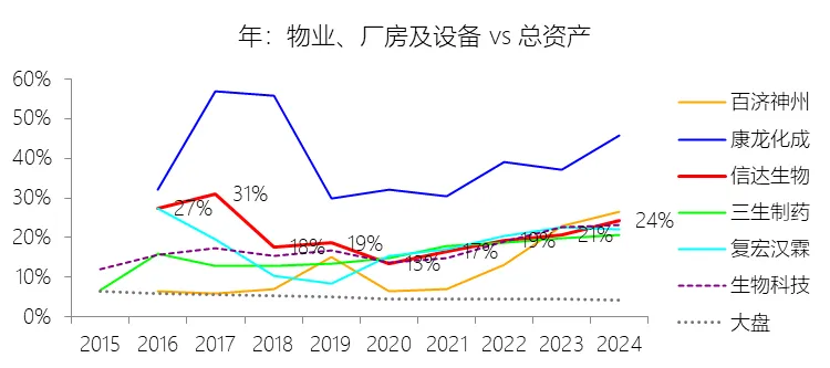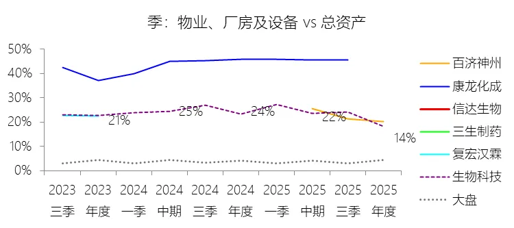 物业、厂房及设备:2025年末,信达生物的物业、厂房及设备为50.61亿元,对比年初减少4.14%,与总资产的比例为13.55%,同比下降10.89个百分点;2015-2024年(十年),此项与总资产的平均比例为19.92%,比生物科技行业的均值高1.45个百分点,长期呈下降趋势。