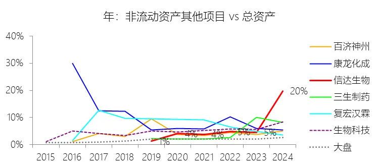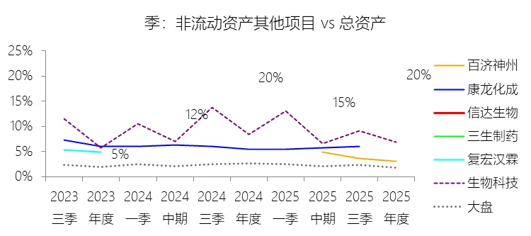 非流动资产其他项目:2025年末,信达生物的非流动资产其他项目为75.78亿元,对比年初增长77.53%,与总资产的比例为20.29%,同比上升0.53个百分点;2015-2024年(十年),此项与总资产的平均比例为6.79%,比生物科技行业的均值高1.12个百分点,长期呈上升趋势。