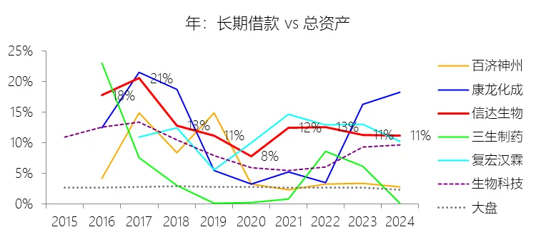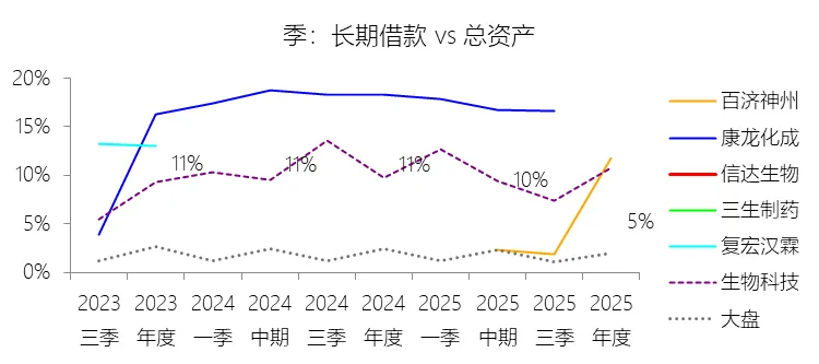 长期借款:2025年末,信达生物的长期借款为19.90亿元,对比年初减少17.52%,与总资产的比例为5.33%,同比下降5.84个百分点;2015-2024年(十年),此项与总资产的平均比例为11.73%,比生物科技行业的均值高3.72个百分点,长期呈下降趋势。