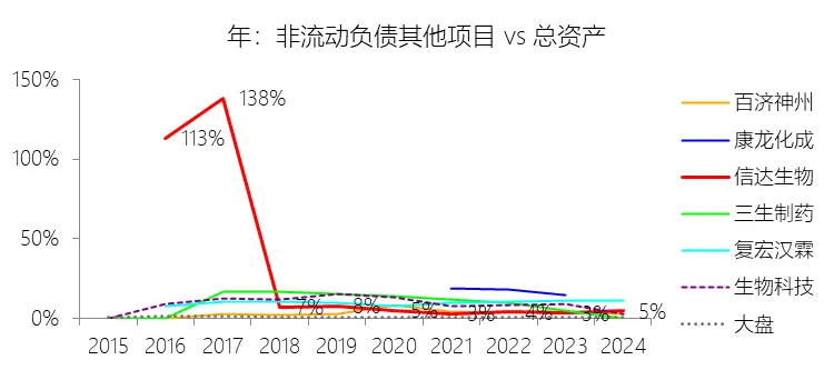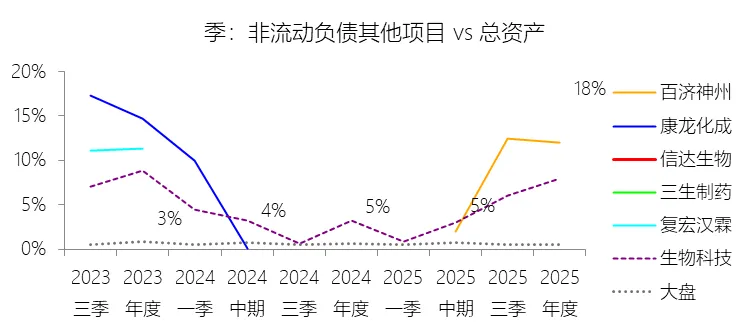 非流动负债其他项目:2025年末,信达生物的非流动负债其他项目为67.92亿元,对比年初增长545.86%,与总资产的比例为18.19%,同比上升13.32个百分点;2015-2024年(十年),此项与总资产的平均比例为10.48%,比生物科技行业的均值高1.56个百分点,长期呈下降趋势。