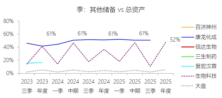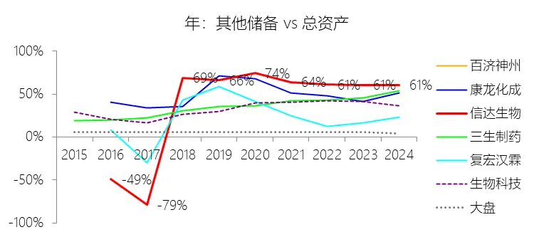 其他储备:2025年末,信达生物的其他储备为193.56亿元,对比年初增长47.56%,与总资产的比例为51.83%,同比下降8.9个百分点;2015-2024年(十年),此项与总资产的平均比例为57.37%,比生物科技行业的均值高20.12个百分点,长期呈上升趋势。