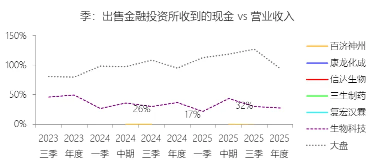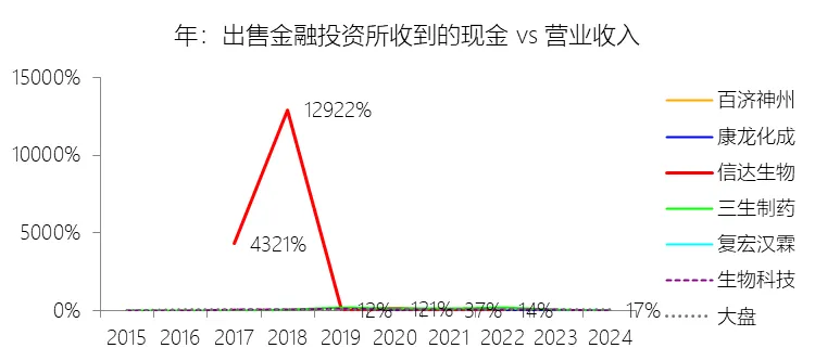 出售金融投资所收到的现金:2025年,信达生物的出售金融投资所收到的现金缺数据,与营业收入的比例无效;2015-2024年(十年),此项合计为106.19元,平均比例为36.15%,比生物科技行业的均值低24.21个百分点,长期呈下降趋势。