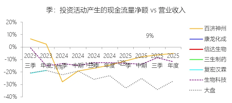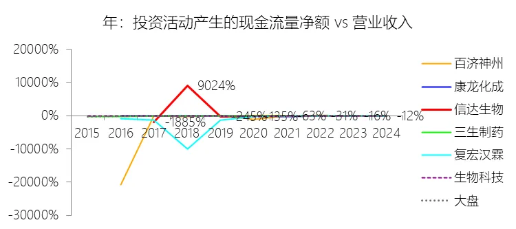 投资活动产生的现金流量净额:2025年,信达生物的投资活动产生的现金流量净额缺数据,与营业收入的比例无效;2015-2024年(十年),此项合计为-141.17元,平均比例为-48.06%,比生物科技行业的均值低10.77个百分点,长期呈下降趋势。