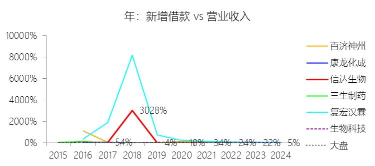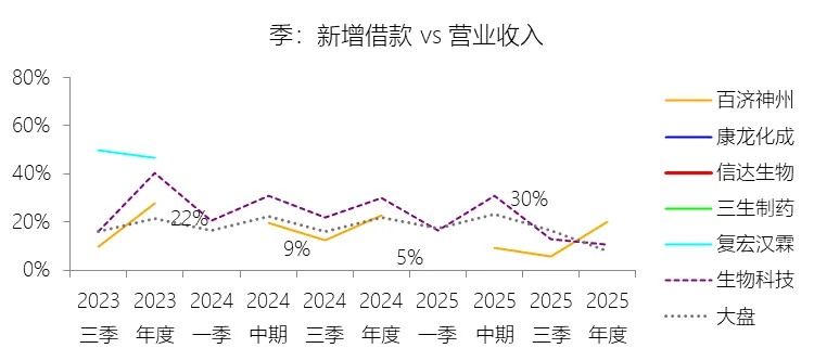 新增借款:2025年,信达生物的新增借款缺数据,与营业收入的比例无效;2015-2024年(十年),此项合计为51.07元,平均比例为17.38%,比生物科技行业的均值低17.15个百分点,长期呈下降趋势。