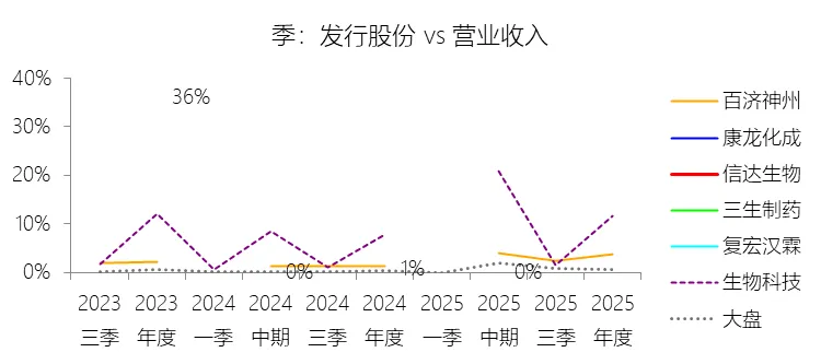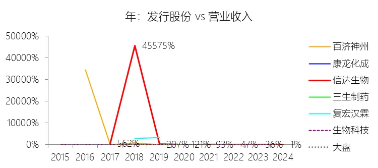 发行股份:2025年,信达生物的发行股份缺数据,与营业收入的比例无效;2015-2024年(十年),此项合计为213.46元,平均比例为72.67%,比生物科技行业的均值高18.07个百分点,长期呈下降趋势。
