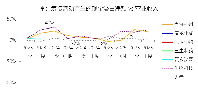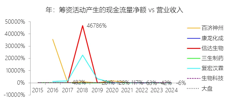 筹资活动产生的现金流量净额:2025年,信达生物的筹资活动产生的现金流量净额缺数据,与营业收入的比例无效;2015-2024年(十年),此项合计为230.60元,平均比例为78.51%,比生物科技行业的均值高4.09个百分点,长期呈下降趋势。