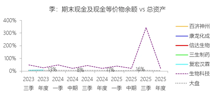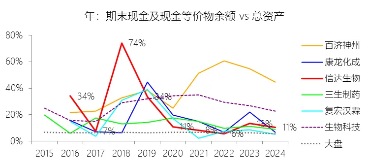 期末现金及现金等价物余额:2025年末,信达生物的期末现金及现金等价物余额缺数据,与总资产的比例无效;2015-2024年(十年),此项与总资产的平均比例为15.74%,比生物科技行业的均值低12.83个百分点,长期呈下降趋势。