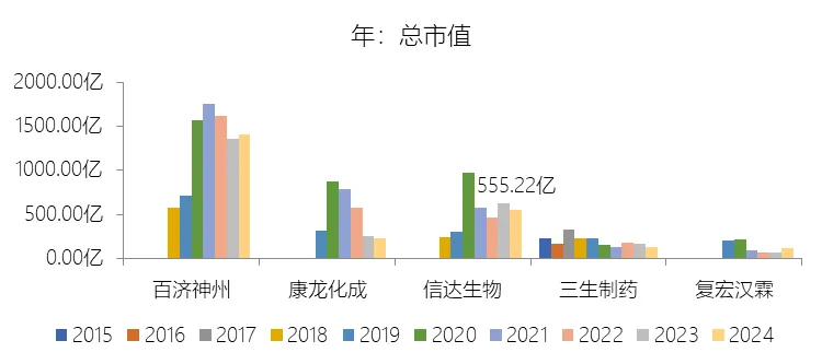 市值增长率:2025年末,信达生物的总市值为1194.64亿元,对比年初增长115.17%,增速同比(去年同期)上升126.8个百分点;2015-2024年(九年)增长127.92%,年复合增长14.72%,比生物科技行业的复合增速低17.3个百分点,长期呈下降趋势。增速短期上升主要由于信达生物在2025年实现了里程碑式的财务突破,年营业收入首次跨越百亿大关并历史性地实现了IFRS及Non-IFRS准则下的全面盈利,其“肿瘤+综合管线”双轮驱动战略在心血管及代谢领域(如玛仕度肽、信必乐等)取得爆发式进展并贡献新增长,同时公司通过与武田制药、礼来、罗氏等达成总交易价值超过220亿美元的重磅全球战略合作,加速了管线全球价值的兑现并获得巨额首付款,加之公司成功被纳入恒生指数成份股成为蓝筹股,以及年内完成大额新股配售并获得武田溢价入股,显著提升了资本市场的认可度与确定性;增速长期下降主要由于公司已成功从高增长预期的研发型Biotech转型为大规模商业化运营的Biopharma,早期市值受核心产品达伯舒上市预期推动曾出现爆发式增长(如2020年增长222.61%),随着市值基数快速扩大,百分比增速自然向稳健增长区间回归,且期间经历了2021-2022年生物医药行业普遍的估值修正以及宏观资本市场波动的结构性调整;增速低于生物科技行业的复合增速主要由于信达生物在2018年上市之初即具备较高的市值基数(约243.6亿元),相较于行业内众多从极低估值起步或在细分爆发赛道中快速冲高的初创公司,其在大体量下的复合增长表现相对稳健但数值偏低,同时核心产品达伯舒在放量过程中经历了多次医保谈判降价,且公司在行业下行周期的估值回撤幅度一定程度上拖累了长期的复合增长表现。