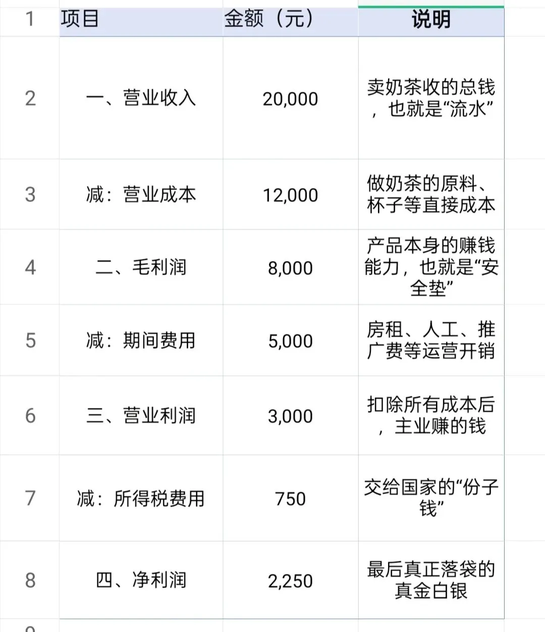 为了让你一眼看懂,我们直接把老王奶茶店的利润表拉出来,对照着看?