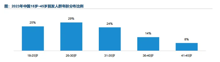 脱发,正在演变成一个世界性难题,据美国脱发协会公布的数据显示,美国有66.7%的男性到35岁时会出现某种程度的明显脱发;到50岁时,大约85%的男性头发会呈现明显稀疏状态。根据中国卫健委公布的数据显示,2020年,中国脱发人群人数高达2.5亿。在全球其他国家,脱发也在影响越来越广泛的人群;与此同时,和女性群体相比,男性群体脱发比例更高。近年来,伴随着生活节奏的加快、工作压力等多种因素影响,脱发同时呈现出年轻化的趋势,根据《2023脱发人群及防脱消费报告》数据显示,2023年中国18岁~45岁人群中,30岁以下脱发人群占比已达到54%。