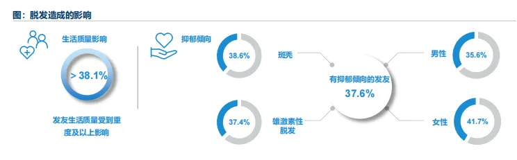 脱发不仅会降低发友的生活质量,还可能会给发友带来严重的心理负担。据发表在《中华皮肤科杂志》的一项研究调查结果显示,整体而言,脱发对生活质量的平均影响程度为中度,其中38.1%以上的发友会受到重度及以上程度的影响;并且,脱发人群生活质量差与抑郁倾向呈显著正相关,37.6%的受访脱发发友有抑郁倾向,女性发友更容易产生抑郁倾向。一项发表在《临床皮肤科杂志》的研究结果同样表明,脱发对25岁以下发友生活质量影响显著高于35岁以上发友,年轻人对自身病情关注程度较高,受脱发带来的困扰更大。脱发会影响发友生活质量,造成抑郁和焦虑的负面情绪;同时,不良的心理和精神因素反过来也会加重或使发友的病情反复,应当加大宣传力度,提高大众对脱发的认知,推动脱发疾病的早诊早治,避免发友因就诊时间晚造成延误治疗。
