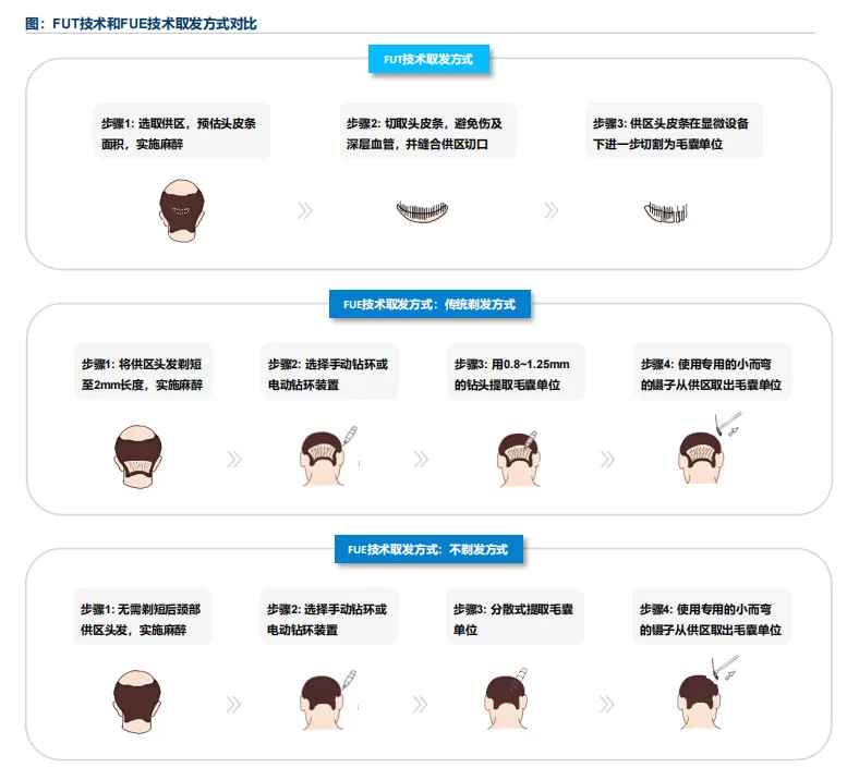 1959年,被称为现代毛发移植之父的美国医生Orentreich使用打孔移植(PunchGraft)的技术进行毛发移植,并发表了“供区优势”的研究理论。这一理论表明,即使毛囊移植至身体的不同部位,也能保留其原始特性。例如,来自非秀顶区域的毛囊即使移植到秀顶区域也会继续生长头发,从而证实了植发作为治疗雄激素性脱发的可行性,引起了人们对植发技术的广泛关注。植发领域最显著的进步出现在上世纪末,FUT技术的出现,使外科医生能够完整地移植毛囊单位及其支撑结构,尽可能模仿自然的毛发生长模式。随后,FUT技术因创伤大,疤痕明显、术后恢复慢逐渐被FUE技术所取代。FUE技术通过直接从供体部位提取单个毛囊,而非像FUT技术需要切除整条头皮皮肤,进而避免了给患者的供体部位留下线性疤痕的缺点,提升了患者体验。不过FUE技术相对而言耗时较长,对技术水平要求更高。