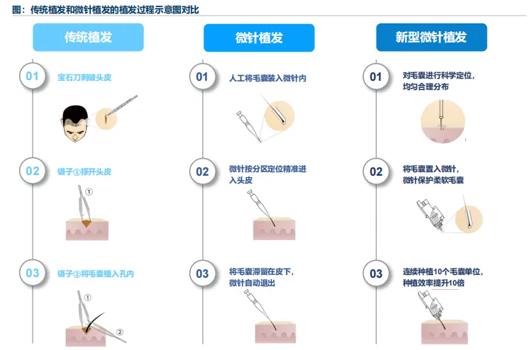 新型微针植发改革了植发器械,可大幅提升手术效率,是FUE技术的最新进展,标志着植发技术领域的进步