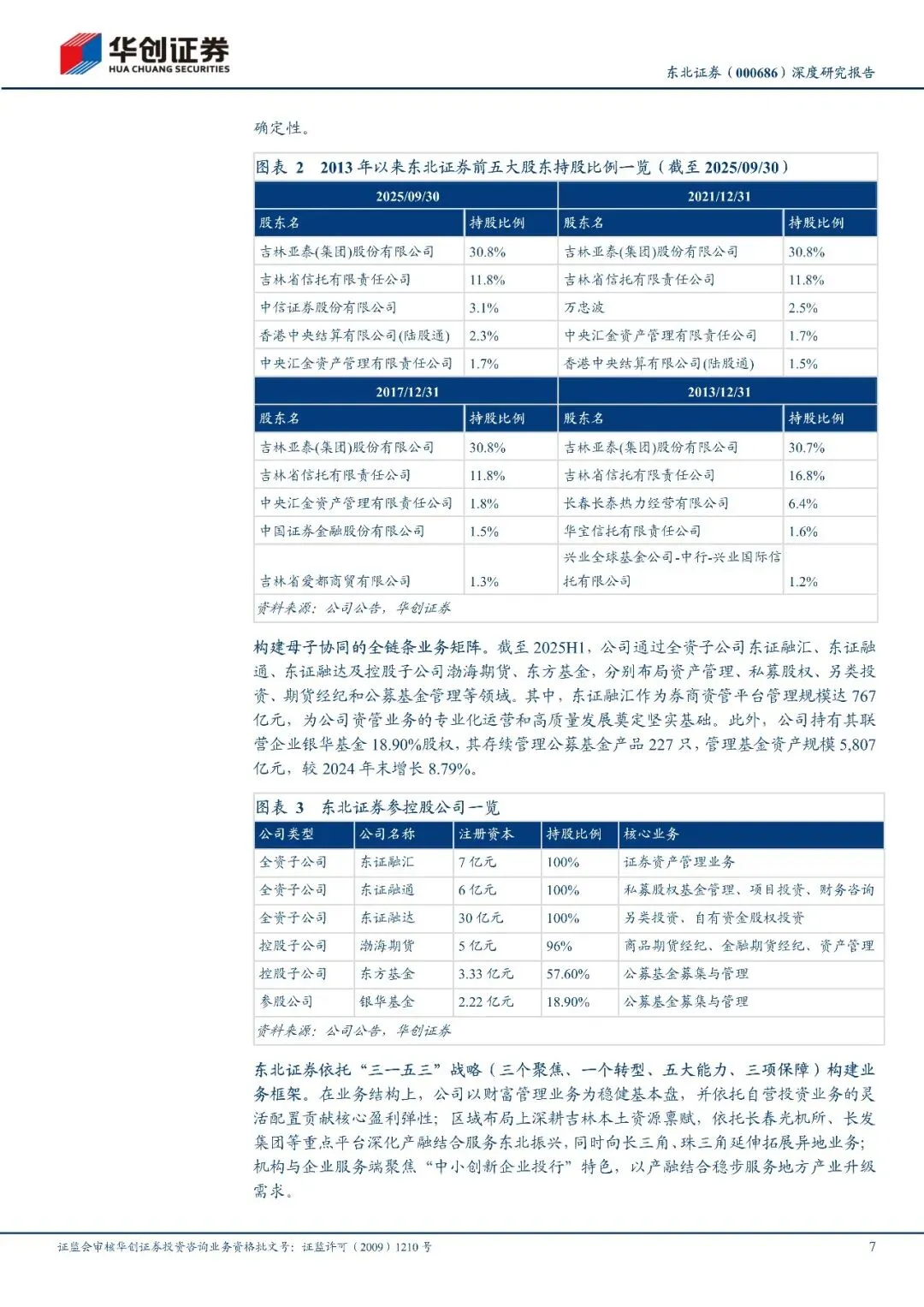 依托股东资源深化综合金融服务。东北证券是东北地区最早房成立的证券公司之一,前身为1988年设立的吉林省证券公司,是东北地区重要的全融机构2024年3月,公司第一大股东吉林亚泰集团被露股权转让计划,拟向长春市城市发展投资控股(集团)有限公司、长春市金融控股集团有限限公司合计转让29.81%股份。截至2025Q3,吉林亚泰集团仍以30.8%持股比例稳居第一大股东,股权变更事项仍在推进中;若转让落地,长发集团将跃升为核心股东。