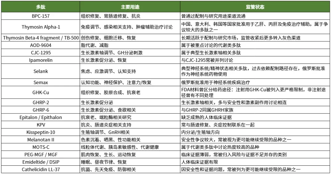 因此,Category 2政策带来的一个现实后果,并不是需求被消灭,而是需求从受监管的配制体系转移到了更难追踪、质量更不透明的灰色市场。对监管者而言,这构成了一个越来越难回避的政策悖论:限制合法配制的初衷原本是降低潜在风险,但在需求持续存在的情况下,结果可能是把一部分消费者推向质量控制更弱、信息更不透明、售后责任更模糊的供应链。也正是在这个意义上,2026年初围绕约14种多肽可能重新回到Category 1的讨论,不只是一次配制名单调整,而是对过去两年监管效果的一次现实检验。