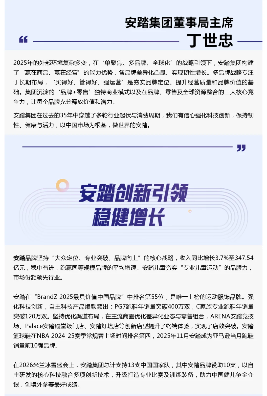 “聚焦跑步的战略巩固了我们作为中国跑步领先品牌的卓越地位。”特步集团董事局主席兼CEO丁水波这样表示。从专业跑鞋到跑步生态圈的构建,特步正在用专业实力赢得市场认可。