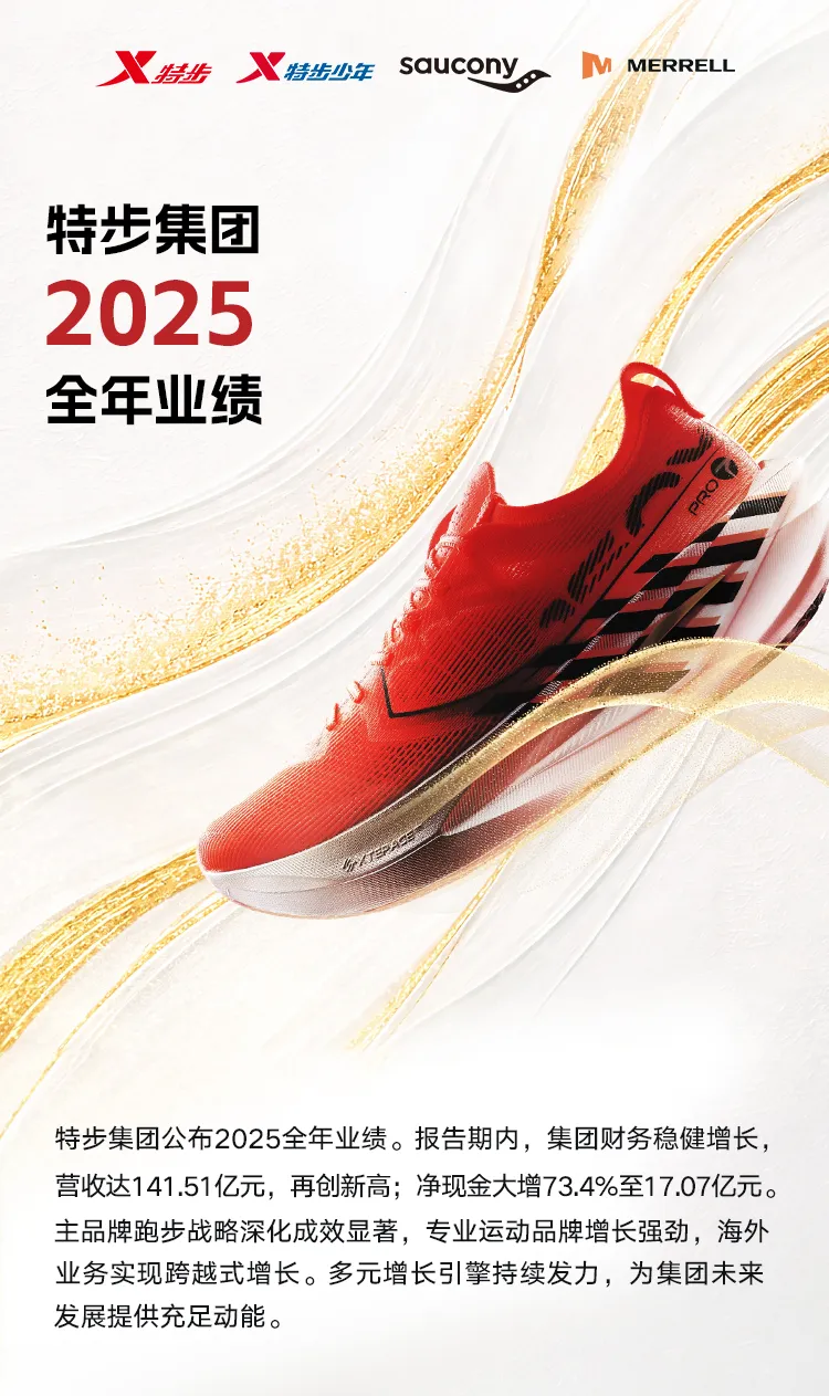 特步集团2025年全年营收141.51亿元,同比增长4.2%;净利润增长10.8%至13.72亿元,净现金大幅增长73.4%至17.07亿元,连续18年保持高比例分红。