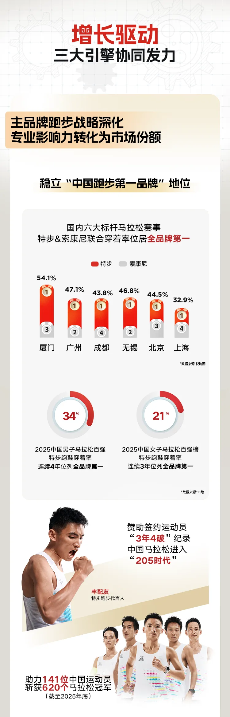 分板块看,特步主品牌收入125.15亿元,同比增长1.5%;而索康尼所在的专业运动分部收入达16.36亿元,同比增长30.8%。作为中国跑步领域的领军品牌,特步“聚焦跑步”战略成效显著。2025年,特步在厦门、上海等六大重点马拉松赛事中穿着率位居榜首,代言人丰配友更在东京马拉松上打破国家纪录,带领中国马拉松进入“205”时代。