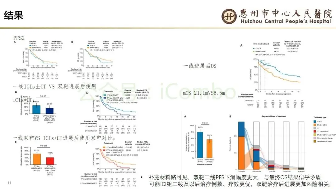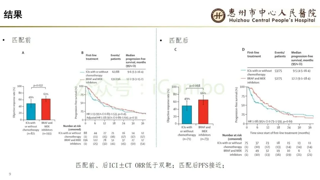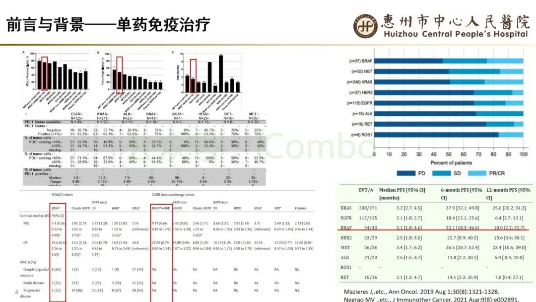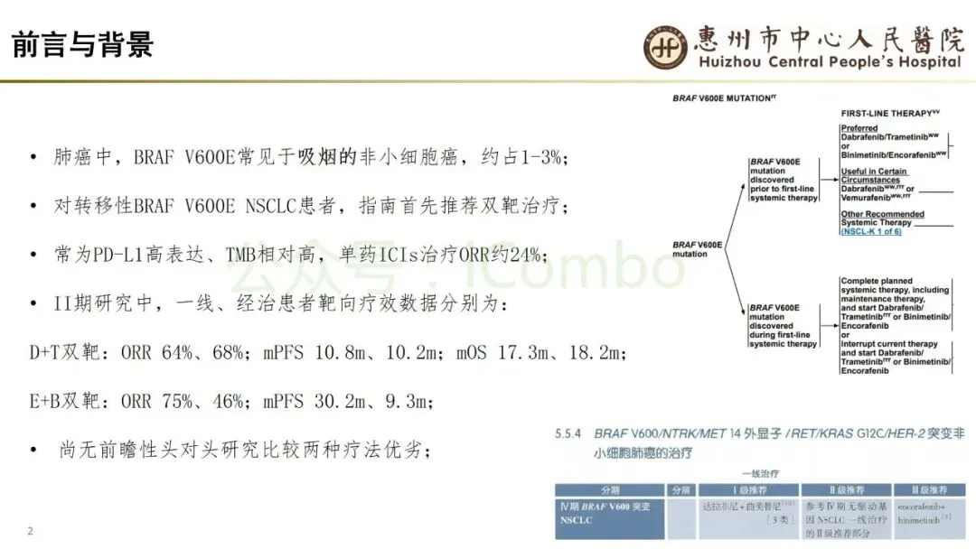 与EGFR、ALK等常见驱动基因突变不同,BRAF V600E在非小细胞肺癌(NSCLC)较为少见(约占NSCLC 1-2%),且多见于吸烟的。在II期临床研究中,BRAF V600E的NSCLC一线双靶治疗的客观缓解率超过60%,同时是当前国内外指南的首选推荐方案。与其他驱动基因阳性的NSCLC相比,BRAF V600E阳性者表现出免疫“热肿瘤”的特征,如PD-L1相对高表达、TMB相对较高等,其一线单药免疫客观缓解率约为24%。在欧美BRAF V600E黑色素瘤中,一线使用双免治疗在总体上展现出优于双靶治疗的生存获益;而在NSCLC中如何排兵布阵仍有待进一步探索。