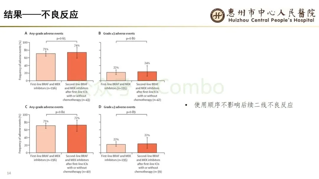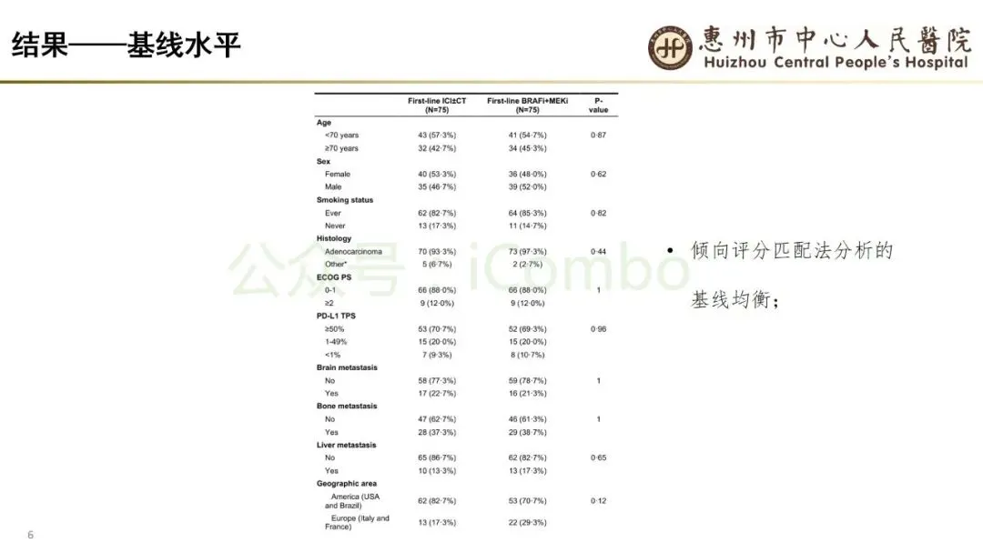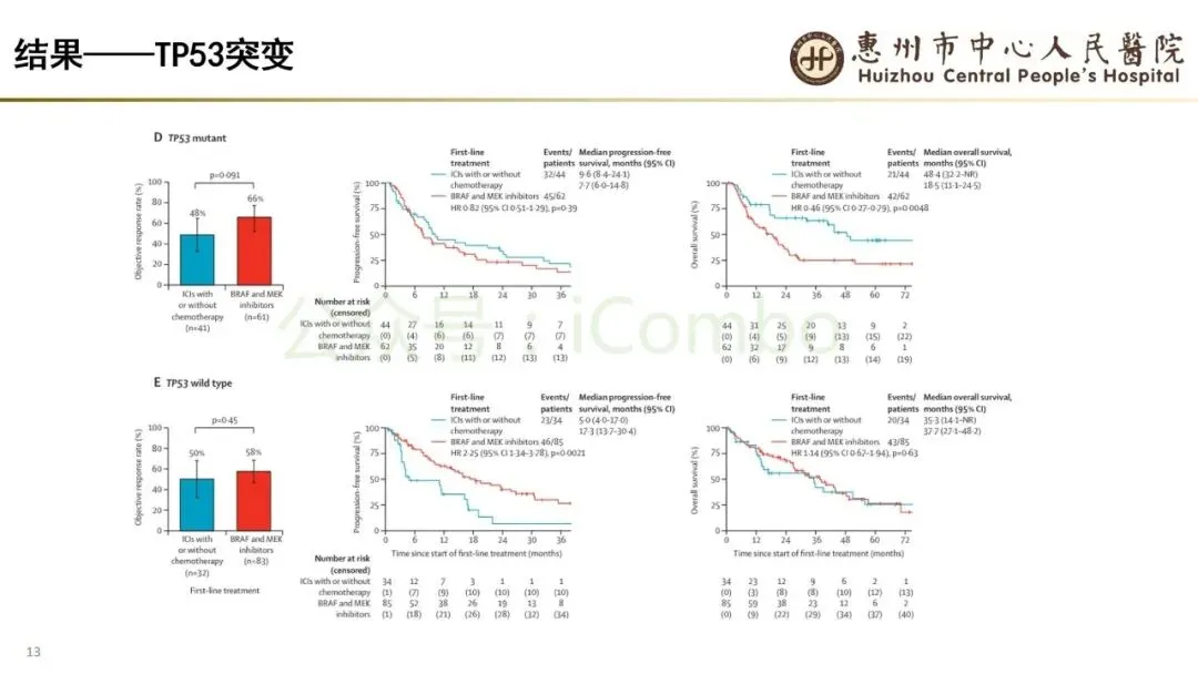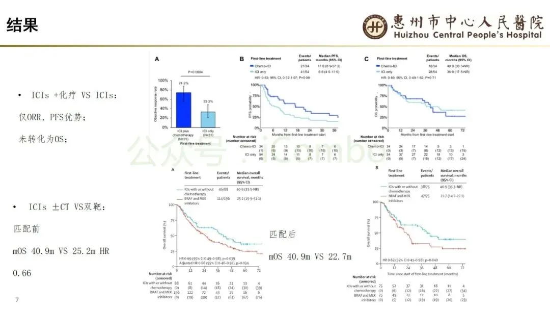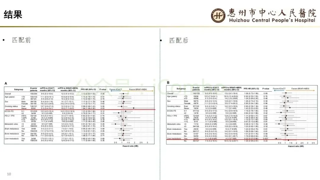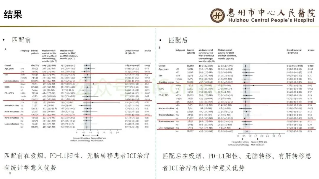 FRONT-BRAF是一项多中心回顾性队列研究,旨在比较一线免疫±化疗与BRAF+MEK抑制剂在BRAF V600E转移性NSCLC人群的疗效。为减少回顾性研究基线不平衡导致的偏倚,本研究进一步采用倾向评分匹配法对基线特征进行匹配分析。研究结果显示,一线免疫±化疗对比双靶治疗在中位总生存(OS)上具有统计学显著优势(mOS 40.9m Vs 25.2m,HR 0.66)。匹配后的亚组分析表明,免疫±化疗在吸烟、PD-L1阳性、无脑转移及伴有肝转移的患者中OS具有统计学显著优势;而匹配后两组的无进展生存期曲线有交叉,无统计学意义差异。此外,一线治疗进展后,初始选择免疫±化疗的患者OS获益更为明显。进一步分子分型分析中,合并TP53共突变患者从一线免疫±化疗中生存获益更为突出。治疗顺序的差异未显著增加后线治疗的不良反应。