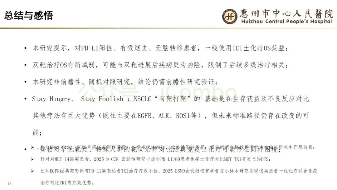 本研究提示,对PD-L1阳性、有吸烟史、无脑转移的BRAF V600E转移性NSCLC患者,一线使用免疫±化疗可带来OS获益。然而,作为一项回顾性研究,该结论尚待前瞻性研究进一步验证。尽管如此,该研究仍为我们带来一定启示:“有靶打靶”可能并非永远不变的准则;针对精细化人群的精准治疗仍待深入探索,医学的进步需要在合理且有依据的基础上,不断审视与挑战当前的“金标准”(Lancet Oncol.2025 Oct;26(10):1357-1369. doi: 10.1016/ S1470-2045(25)00409-7)。