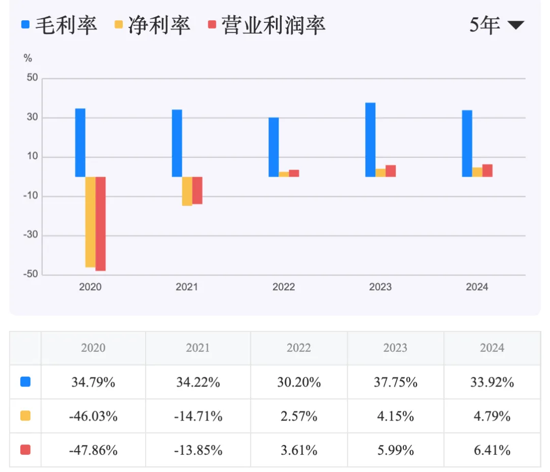 毛利率稳定在较高水平,但期间费用侵蚀严重。 公司毛利率在过去五年间波动中有所回升,2024年为33.92%,虽未超过40%的强竞争优势线,但已脱离2022年的低点,显示出核心制造业务具有一定的护城河。净利率和营业利润率从2020年的深度亏损中大幅修复,2024年分别为4.79%和6.41%,但仍处于较低水平,远未达到20%的“赚钱能力强”标准。这暴露出公司的核心问题:较高的毛利被庞大的期间费用所吞噬。