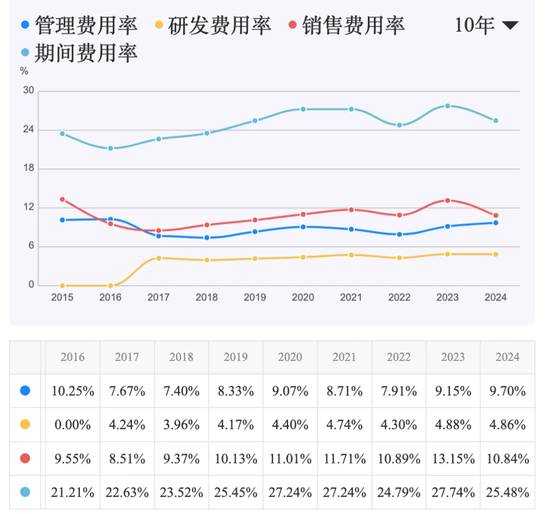 从费用占毛利润的比例看,公司盈利质量承压。 2024年,期间费用(销售、管理、研发、财务)总额占毛利润的比例高达73.5%,处于70%的临界值之上。这意味着公司赚取的毛利绝大部分被日常运营开支消耗,属于“平庸或苦生意”的范畴,盈利能力脆弱。