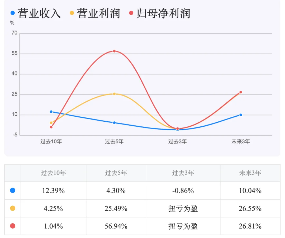 过去3年,营收复合增长率为-0.86%,反映了环境业务“战略收缩”对规模的拖累,但归母净利润实现扭亏为盈,增长逻辑已由“规模扩张”切换为“质量驱动”。展望未来,市场预期公司未来3年营收、营业利润和归母净利润的复合增长率将分别达到10.04%、26.55%和26.81%,显示市场对其盈利持续改善抱有较高期待。