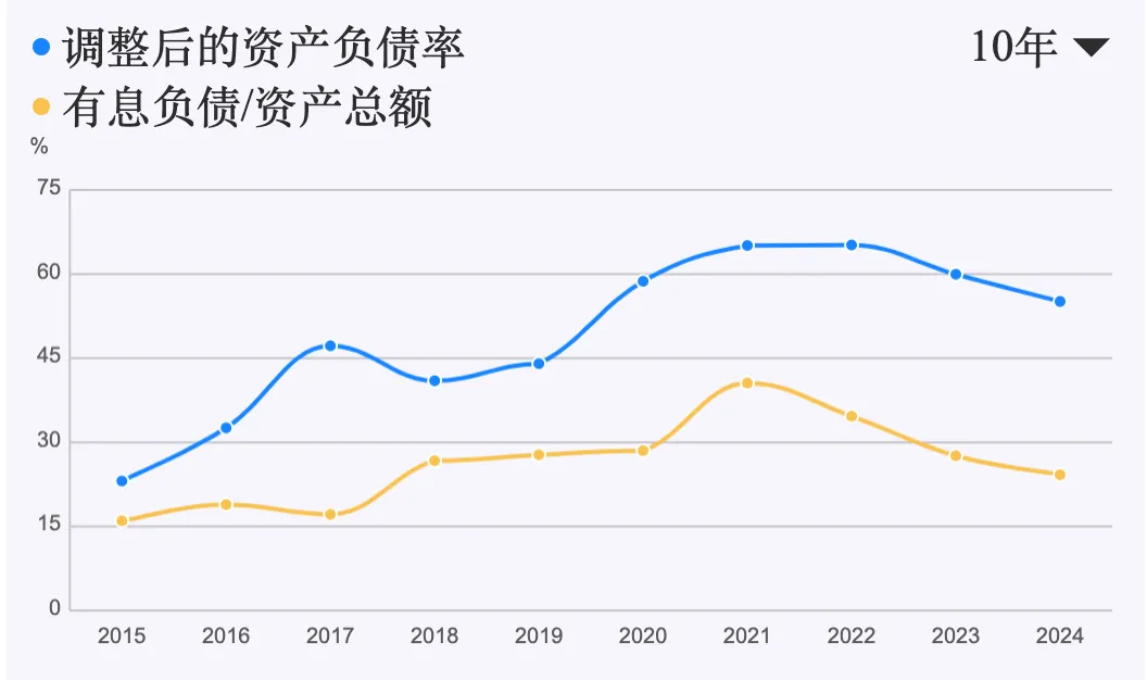 有息负债持续下降,财务结构趋于稳健。 有息负债从2021年高峰的32.30亿元大幅下降至2024年的19.96亿元。同期,现金及现金等价物(10.70亿元)与有息负债的差距缩小,但尚未完全覆盖,仍存在一定的偿债压力。调整后的资产负债率 从2021-2022年的65%左右下降至2024年的55.12%,有息负债/资产总额 也从40.57%的高点降至24.23%,均显示公司通过降杠杆显著改善了财务风险。