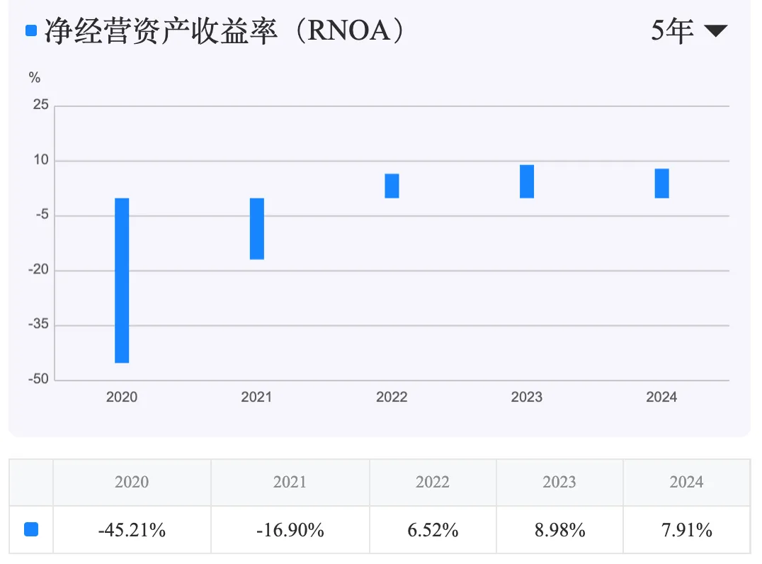 净经营资产收益率(RNOA)同步改善。 RNOA从2020年的-45.21%恢复至2024年的7.91%,表明管理层配置经营资产的效率和盈利能力已回归正常区间,但距离优秀水平(>15%)尚有距离。