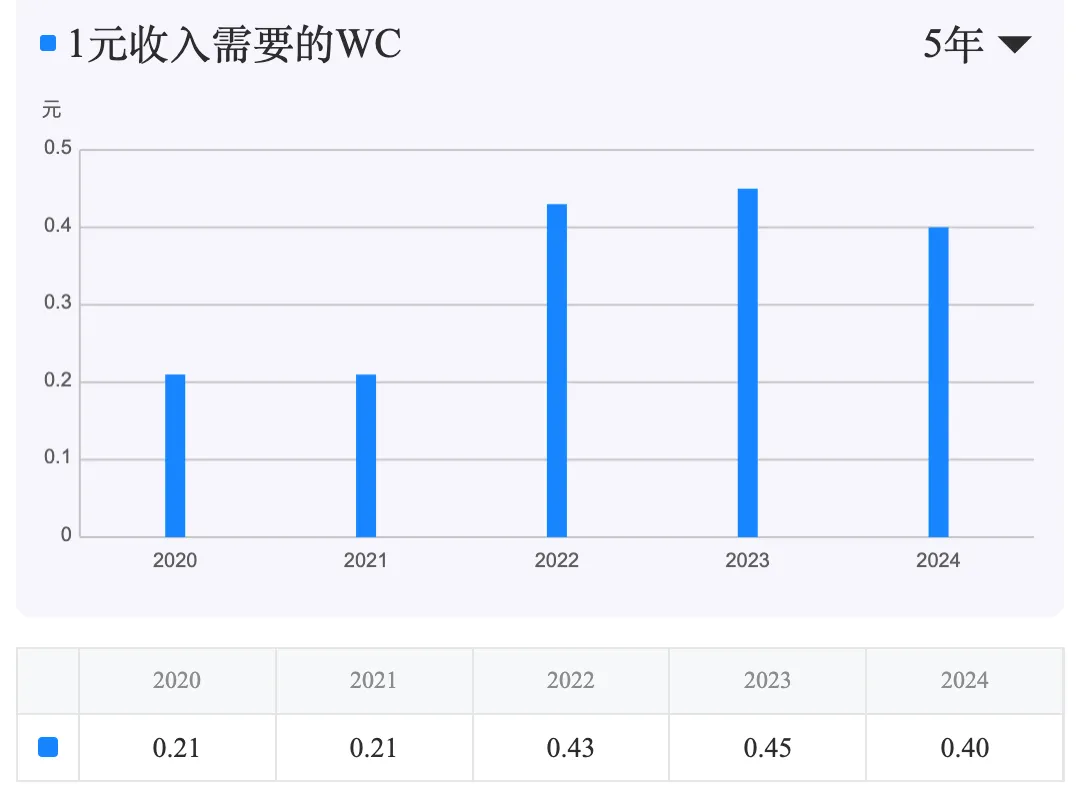 营运资金需求偏高,占用资金效率一般。 2024年营运资金(WC)为20.46亿元,为正值且数额较大。1元收入需要的WC为0.40元,意味着公司每创造1元收入,需要预先投入0.40元的流动资金。这个数值横向对比并不算低,反映了公司在产业链中对上下游的占款能力偏弱,需要为运营垫付较多资金。
