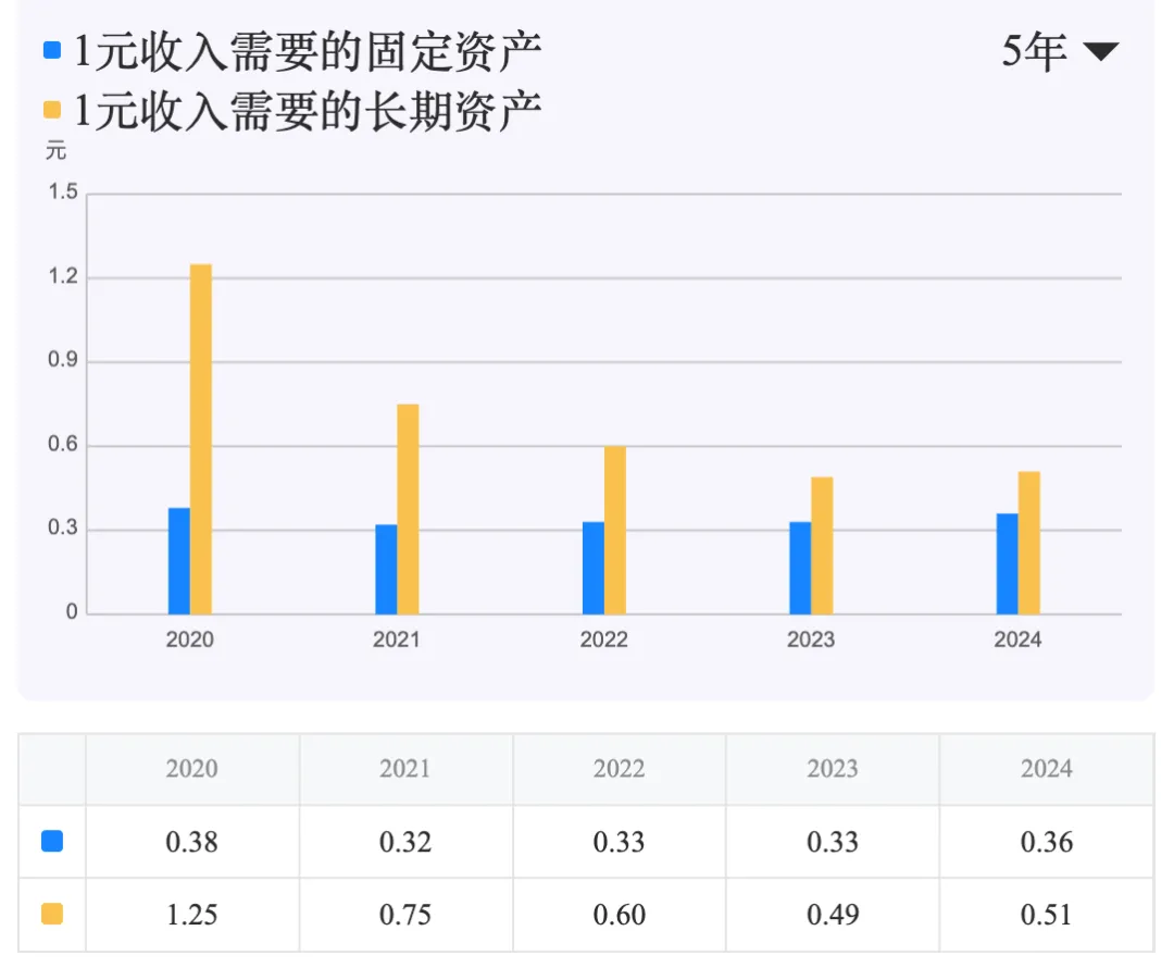 固定资产投入产出效率尚可。1元收入需要的固定资产 近五年在0.32-0.38元之间波动,2024年为0.36元,显示公司不属于极端重资产模式。1元收入需要的长期资产 从2020年的1.25元显著下降至2024年的0.51元,与固定资产的差距缩小,主要得益于非流动资产总额的大幅减少,资产结构优化。