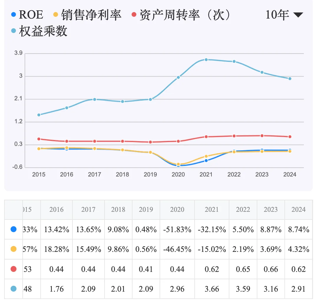 销售净利率为4.32%:产品盈利能力仍较弱,是拉低ROE的首要因素。 资产周转率为0.62次:资产运营效率一般,仍有提升空间。 权益乘数为2.91:财务杠杆已从高位(2022年3.59)显著下降,对ROE的贡献减弱。