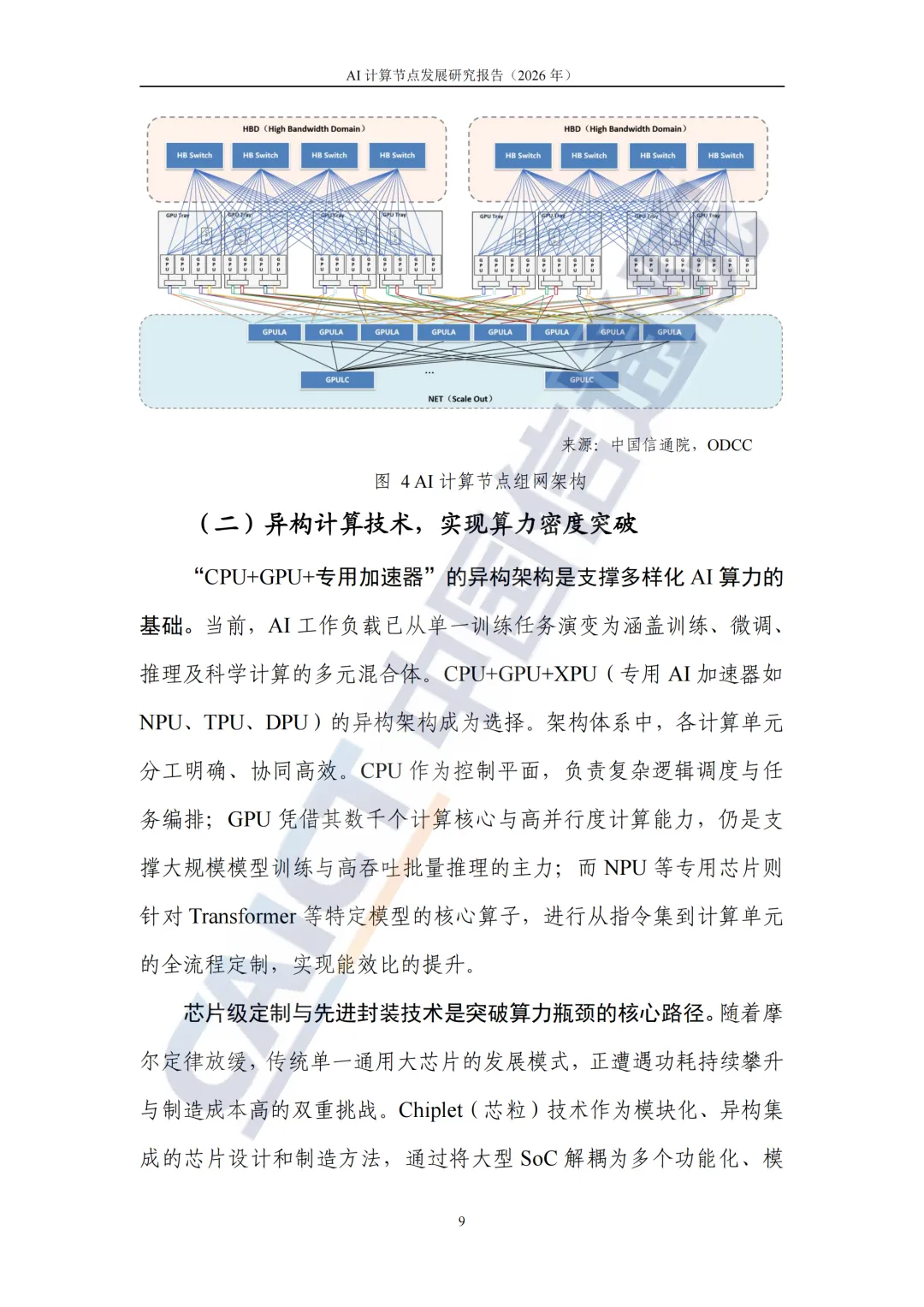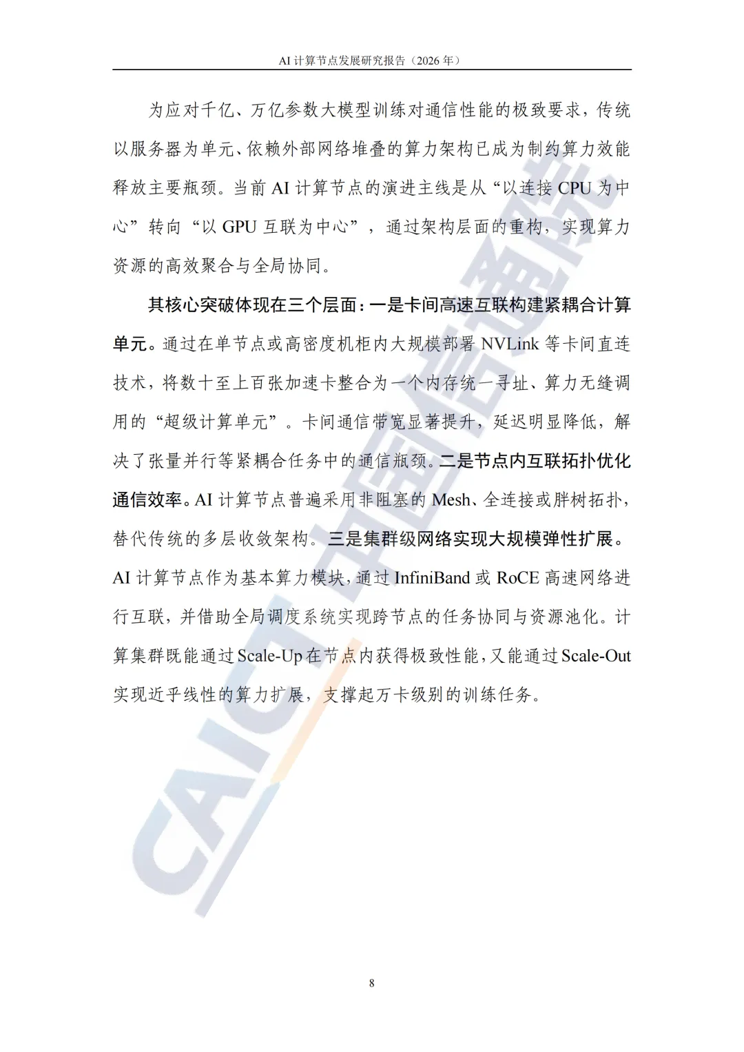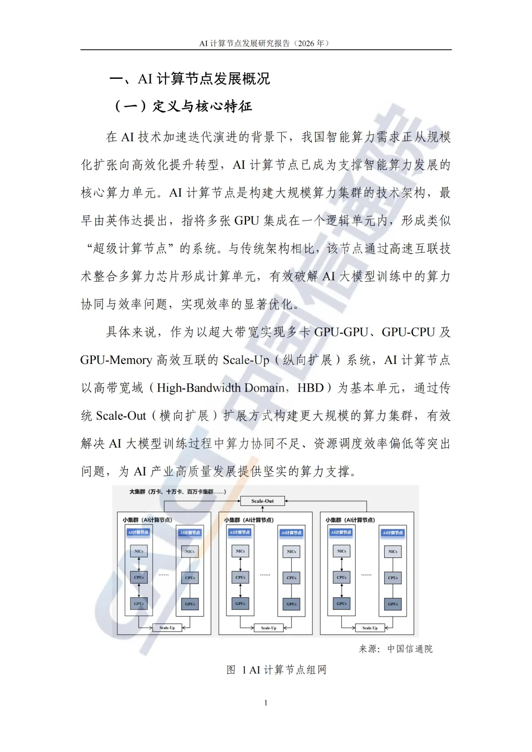 中国信通院发布的《AI计算节点发展研究报告(2026年)》系统解答了这些问题。报告指出,AI计算节点作为通过高速互联技术融合多算力芯片形成的规模化计算单元,正成为破解AI大模型训练中算力协同与效率难题的关键。