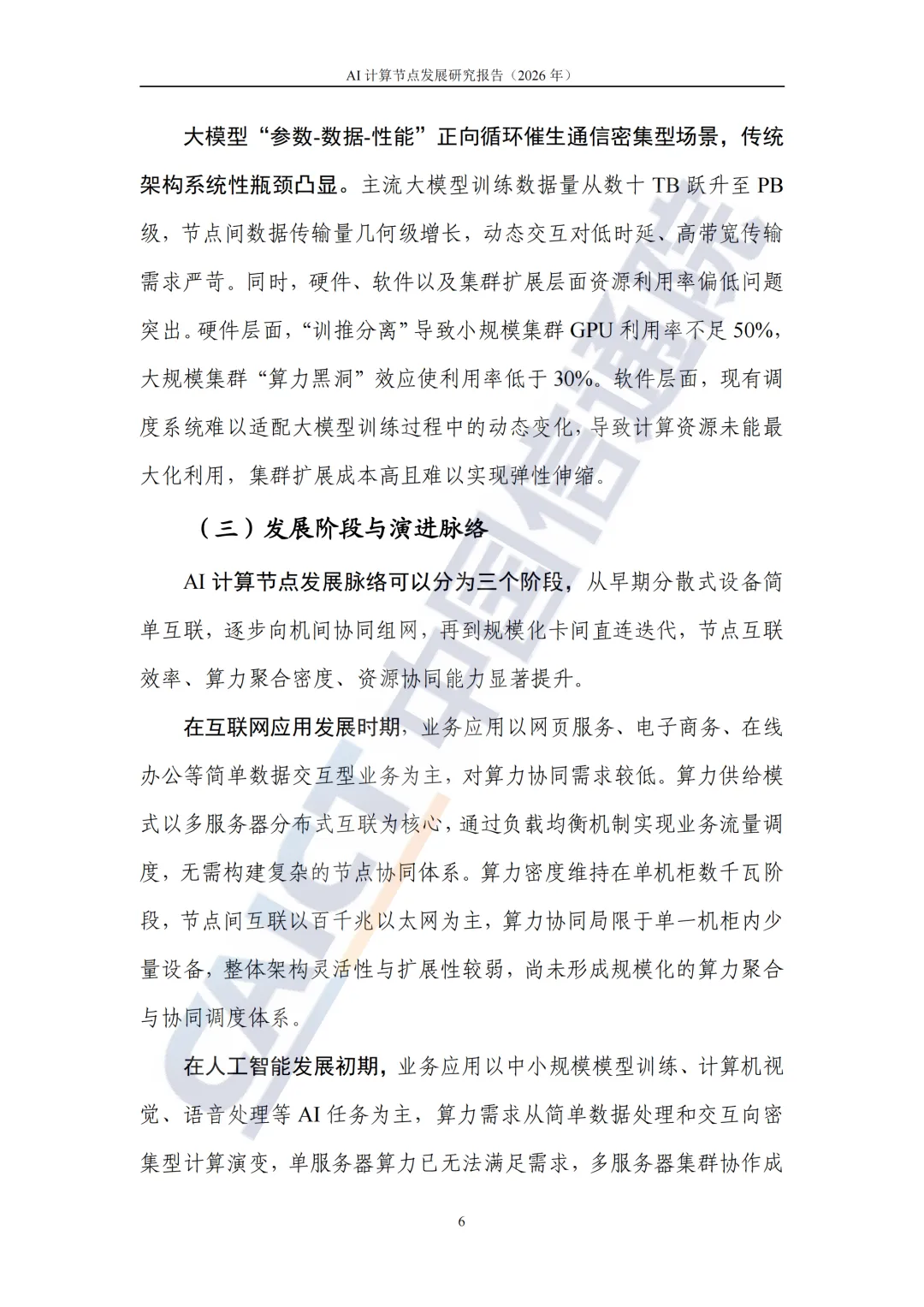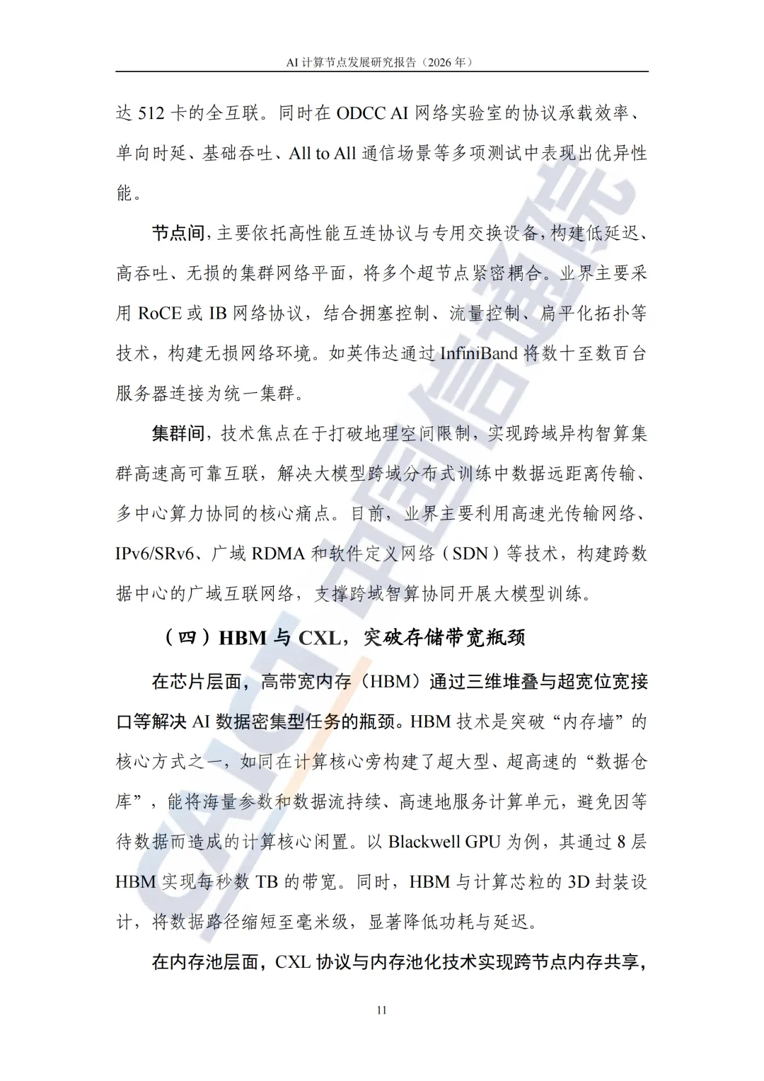 报告深入分析了AI计算节点的核心技术。通过节点架构重构,从以CPU为中心转向以GPU互联为中心,构建紧耦合计算单元并优化集群级网络,实现算力高效聚合与弹性扩展。
