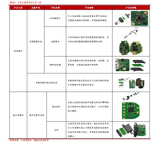 以智能驾驶感知系统为核心,奠定高级辅助驾驶系统根基。公司主要产品为汽车智能驾驶感知系统,包括车载摄像系统、车载视频行驶记录系统和超声波雷达系统等产品。公司主要产品具有定点性特征,根据整车厂商特定车型定向研发和生产。产品主要分为视觉感知与超声波感知两大类,视觉感知的主要产品包括车载视频行驶记录系统、车载摄像系统(包括环视摄像头、后摄像头和AVM 控制器);超声波感知的主要产品为超声波雷达系统,包括雷达探头和主机。