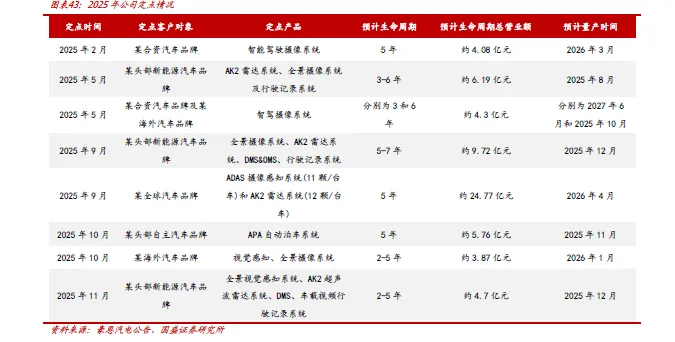 公司建立多元化客户体系,新能源业务不断提升。豪恩汽电作为智能驾驶感知系统供应商,已建立起覆盖全球主流车企的多元化客户体系。截至2025 年9 月,公司在手定点金额合计约209 亿元。公司已与德国大众、上汽大众、一汽大众、奥迪汽车、Stellantis、雷诺全球、福特全球以及长城汽车、吉利汽车、小鹏汽车、比亚迪等众多国内外知名汽车整车制造商建立了长期稳定的合作关系,为公司后续业绩增长提供了有力支撑。公司2024 年新能源业务收入占比已达到约50%,体现了其在电动化趋势下的成功转型。通过长期合作,豪恩汽电与这些客户形成了稳定供应关系,并凭借全栈产品方案持续提升单车配套价值,巩固了其作为国产智能驾驶感知系统重要供应商的市场地位。