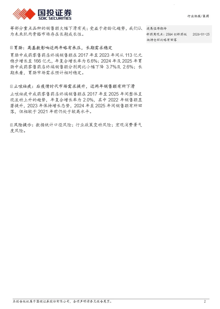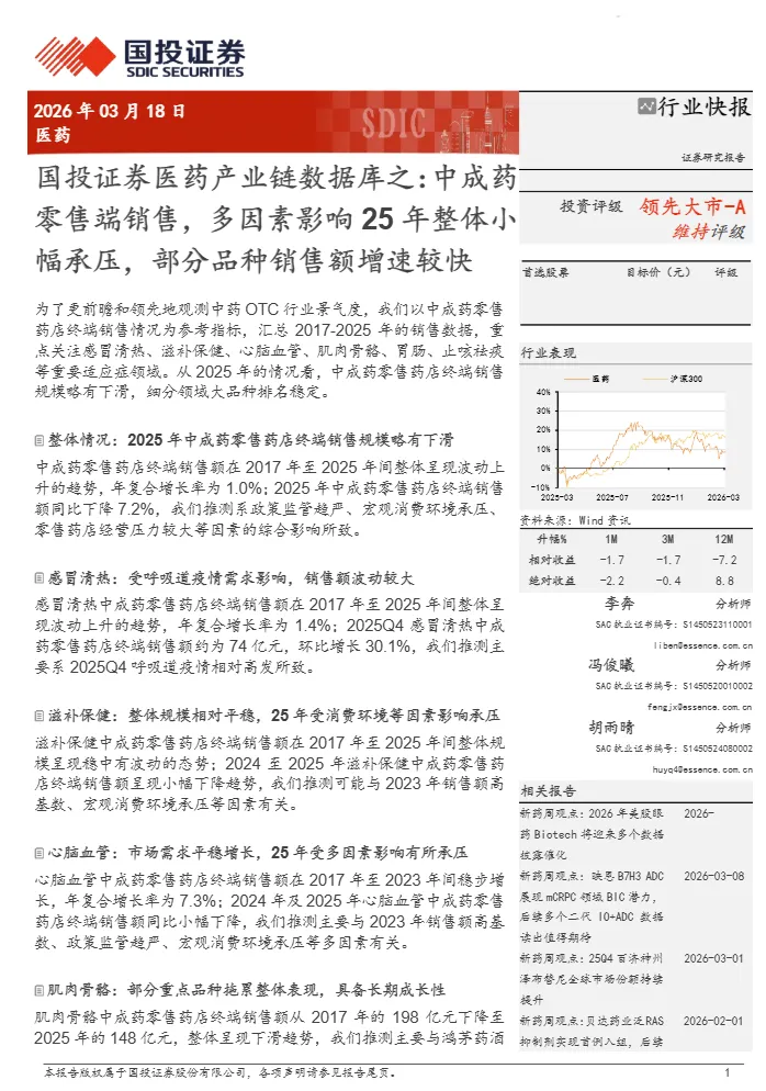 部分信息来源于:国投证券-医药行业产业链数据库之:中成药零售端销售,多因素影响25年整体小幅承压,部分品种销售额增速较快-260318